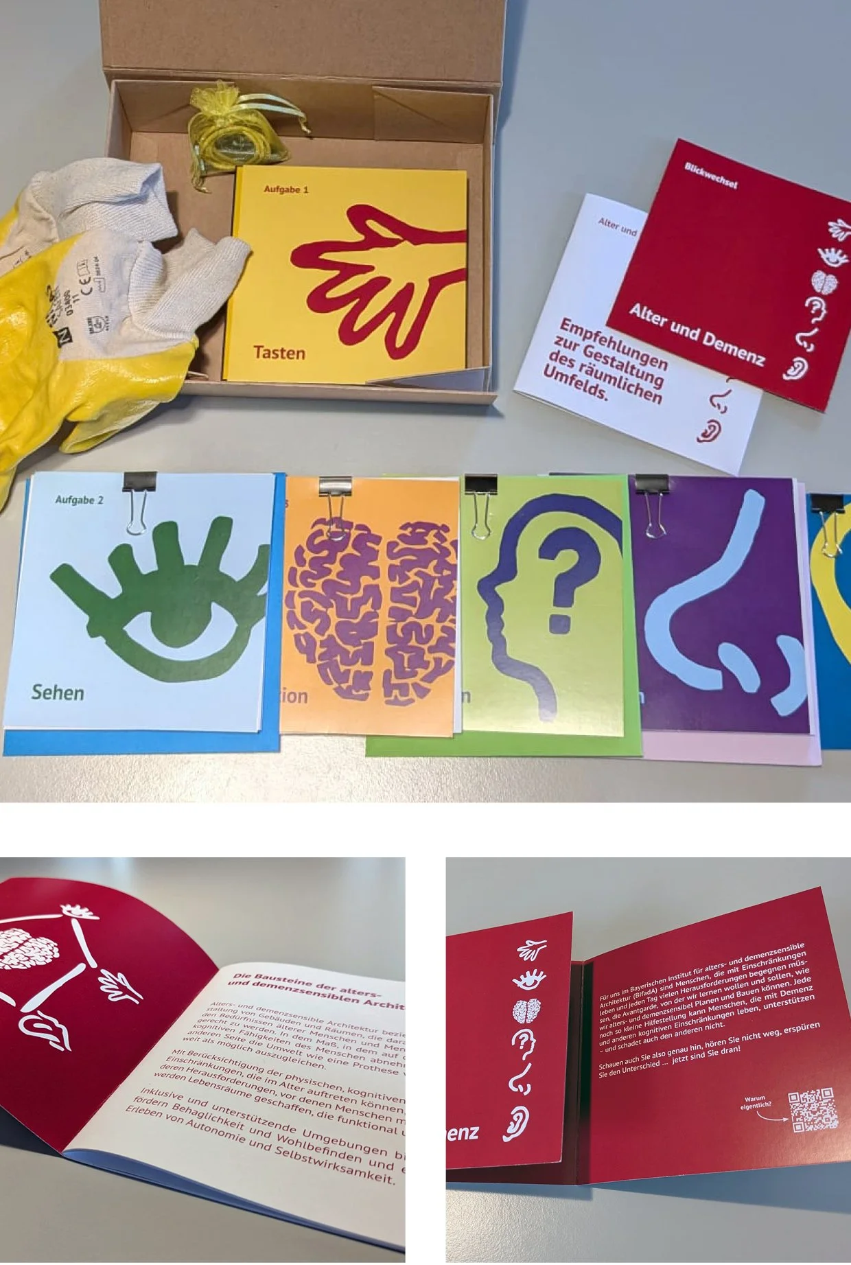 Aufgaben zum Ausprobieren und Nachspüren in sechs Bereichen: Tasten, Sehen, Hören, Riechen, Routinen und Kognition